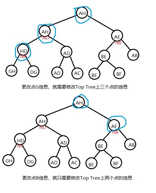 现在我们在维护时要对 𝑇 T 中某个点 𝑥 x 的权值进行修改,很明显,我们就需要更改 Top Tree 中所有簇信息包含 𝑥 x 的节点信息,这样做单次时间复杂度会是 𝑂 ( 𝑛 ) O ( n ) 级别的。